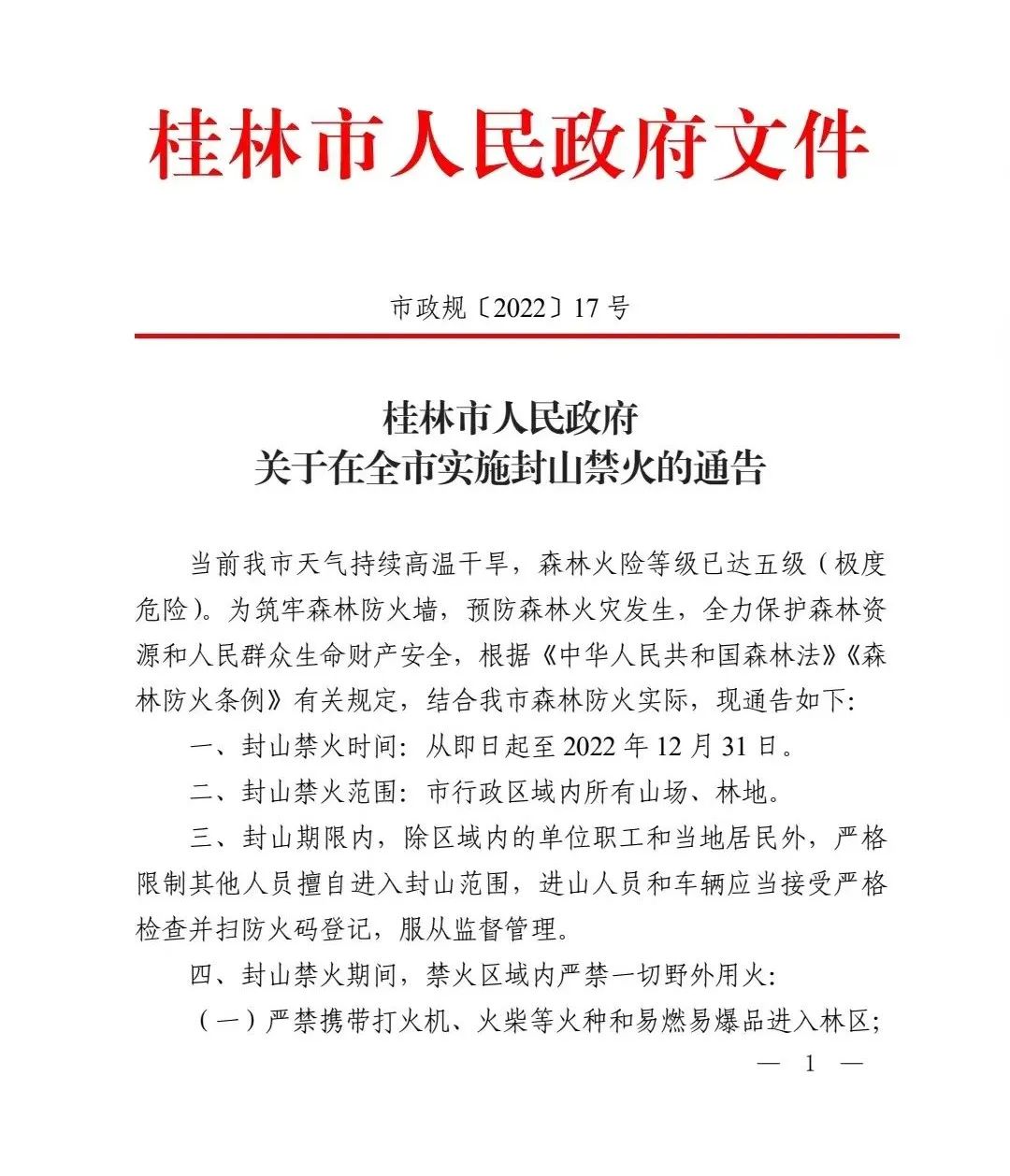 【通知公告】桂林市人民政府关于在全市实施封山禁火的通告