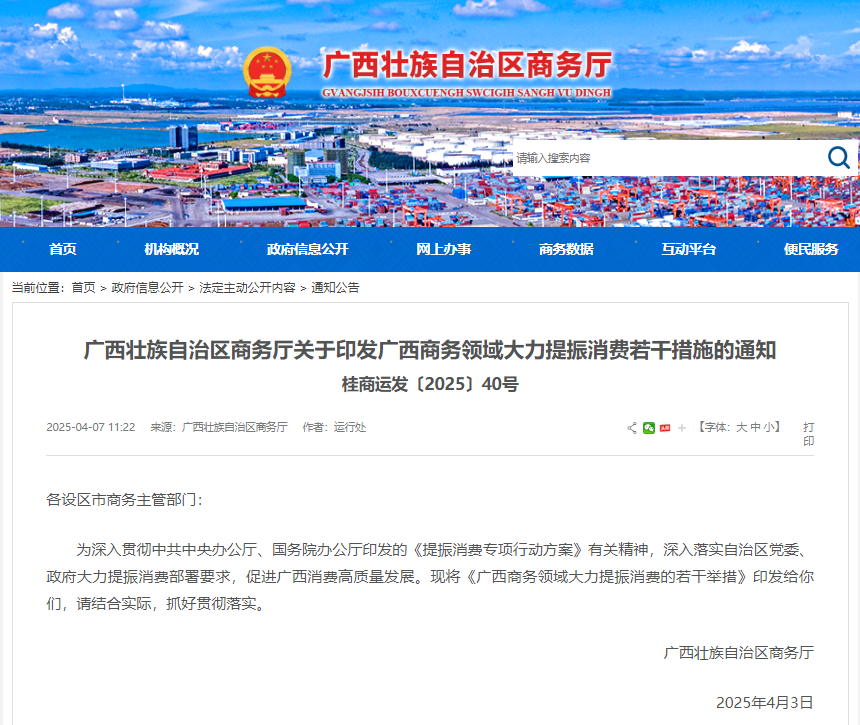4月7日自治区商务厅发布了《广西商务领域大力提振消费的若干措施》,其中提出实施五大行动21条举措系列举措惠民生、促消费给居民、企业送上了政策“大礼包”。