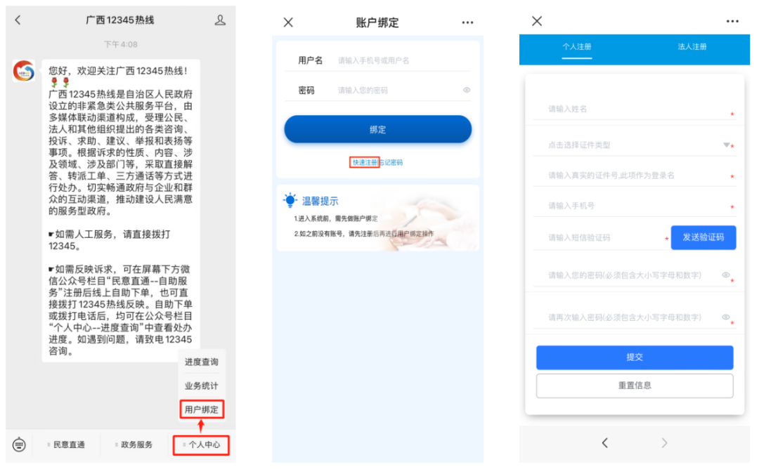 打开“广西12345热线”微信公众号,点击【个人中心】菜单选择【用户绑定】,未有账号可点击【快速注册】填写页面信息进行绑定,完成绑定及登录。