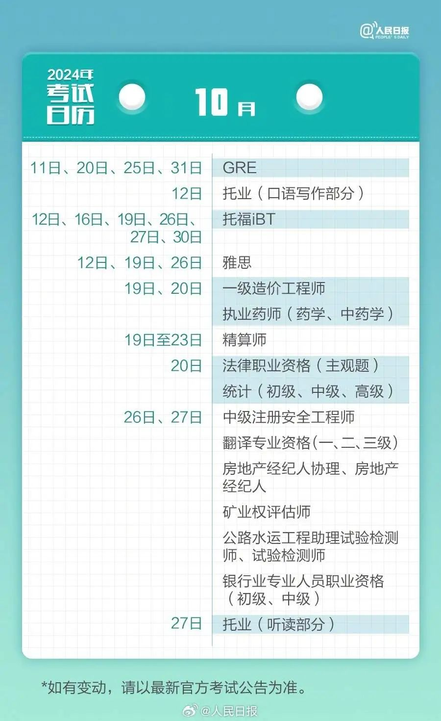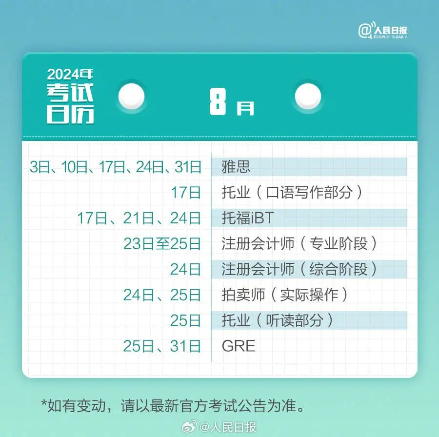 下面为你准备了考试日历