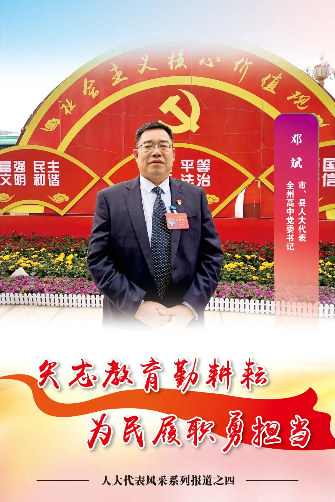 “作为一名人民教师,我从教39年,炽热的教育情怀始终如初。作为一名人大代表,我会一如既往地立足专业特长,进一步献良策、支实招,把履行代表职责与做好本职工作结合起来,为办好人民满意教育贡献一份力量。”市、县人大代表、全州高中党委书记邓斌表示。