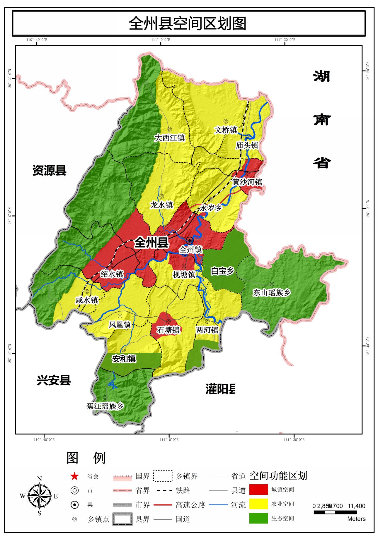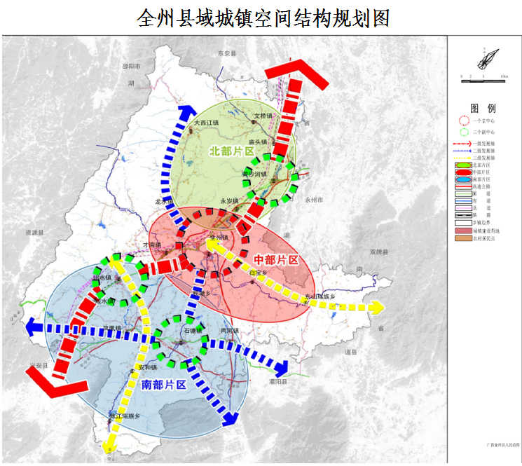 构建“五组团七片区”城区发展格局。以撤县设市作为未来城市建设标准,按照县城拓展“北延、东扩、西并、南伸”的发展思路,构建“五组团七片区”城区发展格局。五组团,即中心组团、城西组团、动车站组团、城南组团、江东组团。中心组团包括老城区、城北新区和城北拓展区3个片区,重点发展商业、金融、文体医疗、旅游等服务业,完善行政、综合商住功能。城西组团主要是城西工业集中区及沿国道至才湾脚山铺,重点布局装备制造、绿色化工、机械、电子、轻纺、食品、农产品加工和红色文旅等产业。动车站组团以全州南站和城西汽车客运站及桂北粮食仓储物流中心为核心,重点发展仓储和商贸物流业,打造桂北湘南区域性物流基地,汽车、火车物流园。城南组团,将501省道改道南移,将穿越城区部分改为市政道路,与城南工业园区至枧塘集镇合建城南产业新城,拉大城市框架,与城北新区形成南北呼应。以城南工业园区为核心,重点发展机械、酿酒、医药、铁合金、农产品加工、花卉园林等产业。提升城南工业集中区建设,重点实施铁合金产业升级换代。江东组团以产城融合为主导,建设现代文旅康养宜居新区,包括雷公岭居住区和江湾居住区,重点发展文化、教育、康养、休闲旅游、房地产等业态,逐步打造成文化教育、旅游休闲、生态宜居的现代化新城区。七片区,包括老城区、城北新区、城北拓展区、城西工业集中区、城南工业园区、雷公岭居住区和江湾居住区。