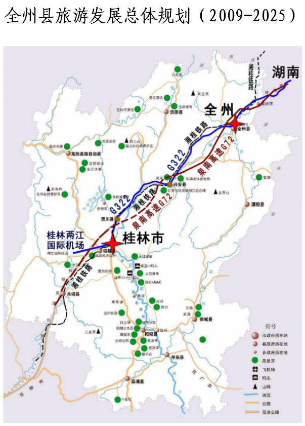 交通区位优势明显。全州作为桂北湘南接合部,位于北部湾经济圈、长株潭经济圈、粤港澳大湾区、珠江-西江经济带交汇中心,经济交通区位显赫。其地处湘桂走廊,湘江上游,是广西的北大门,是桂林市域副中心城市,又是桂北湘南的物资集散中心,与两省8县相邻,是具有两千多年历史的古邑,是湘桂之交通枢纽,是南进岭南、北入中原的兵家必争之地。作为湘桂门户,全州交通便利通达。湘桂铁路及湘桂高铁贯穿全境,并设有全州高铁站,衡昆高速、泉南高速、夏蓉高速、国道322线、省道201线、省道303线、省道501线等穿越县境,到桂林两江国际机场仅一个半小时车程,距长沙、南宁、广州、贵阳等四个省会城市仅3小时高铁车程。