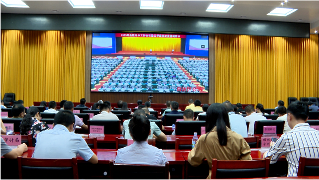 7月25日,2025年全区年中工作会议暨三季度经济发展调度会在南宁召开。县长梁德锋,县人大常委会主任庄慧琼等县四家班子领导在我县分会场收听收看会议。