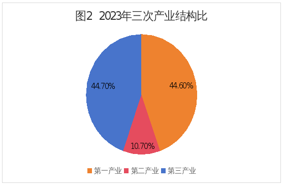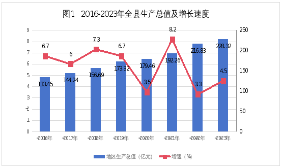 初步核算,全年全县生产总值(GDP)228.32亿元,按可比价计算比上年增长4.5%。分产业看,第一产业增加值101.90亿元,增长4.7%;第二产业增加值24.32亿元,下降1.1%;第三产业增加102.10亿元,增长5.8%。三次产业增加值占地区生产总值的比重分别为44.6%、10.7%和44.7%,对经济增长的贡献率分别为44.3%、-3.1%和58.8%。