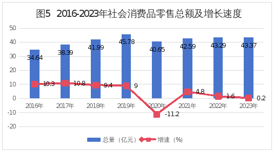 全年社会消费品零售总额43.37亿元,比上年增长0.2%。其中,城镇消费品零售总额31.76亿元,比上年增长0.2%;乡村消费品零售总额11.62亿元,比上年增长0.2%。