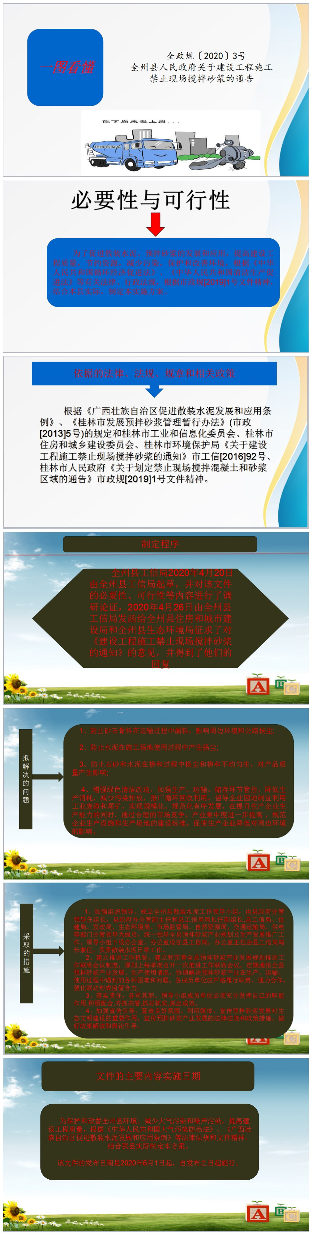 全州县工信局2020年4月20日由全州县工信局起草,并对该文件的必要性、可行性等内容进行了调研论证,2020年4月26日由全州县工信局发函给全州县住房和城乡建设局和全州县生态环境局征求了对《建设工程施工禁止现场搅拌砂浆的通知》的意见,并得到了他们的回复: