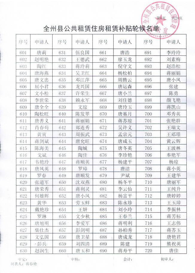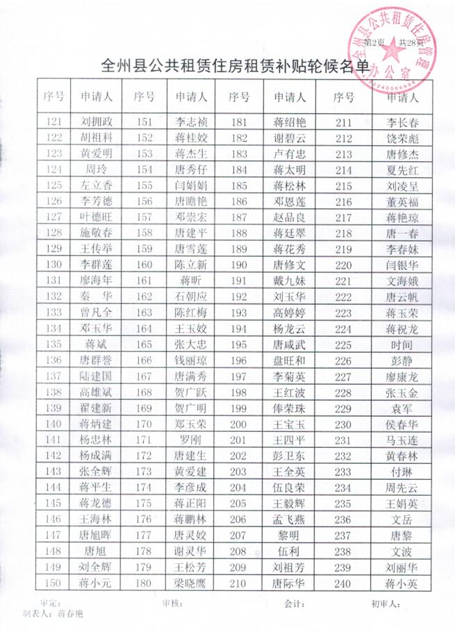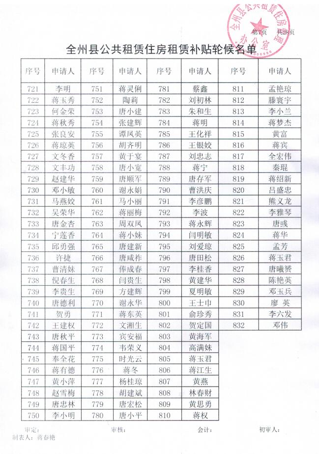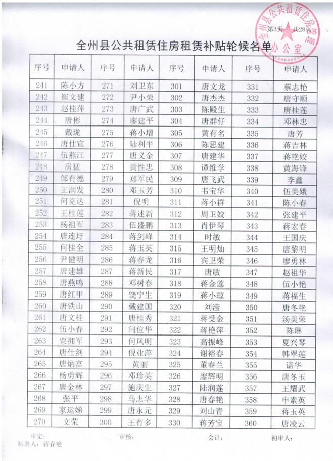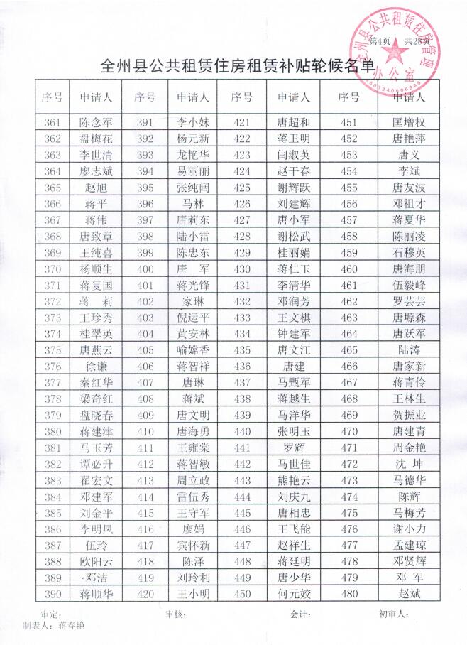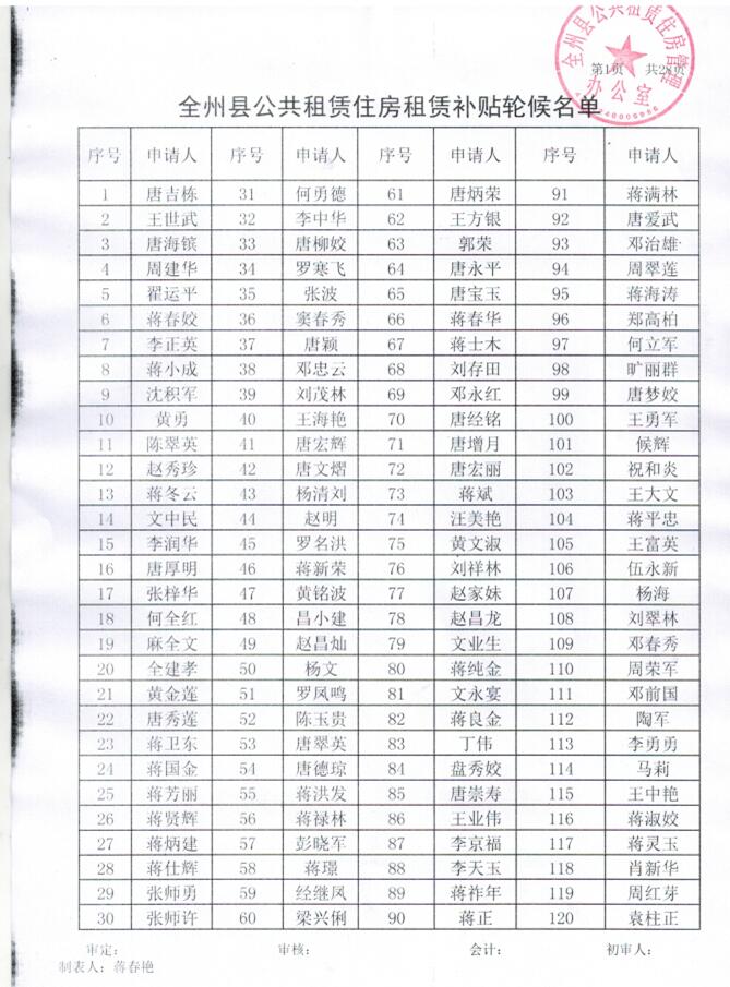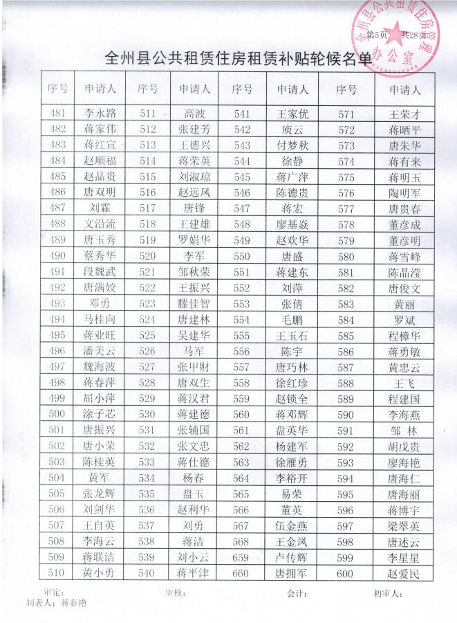 全州县公共租赁住房租赁补贴轮候名单