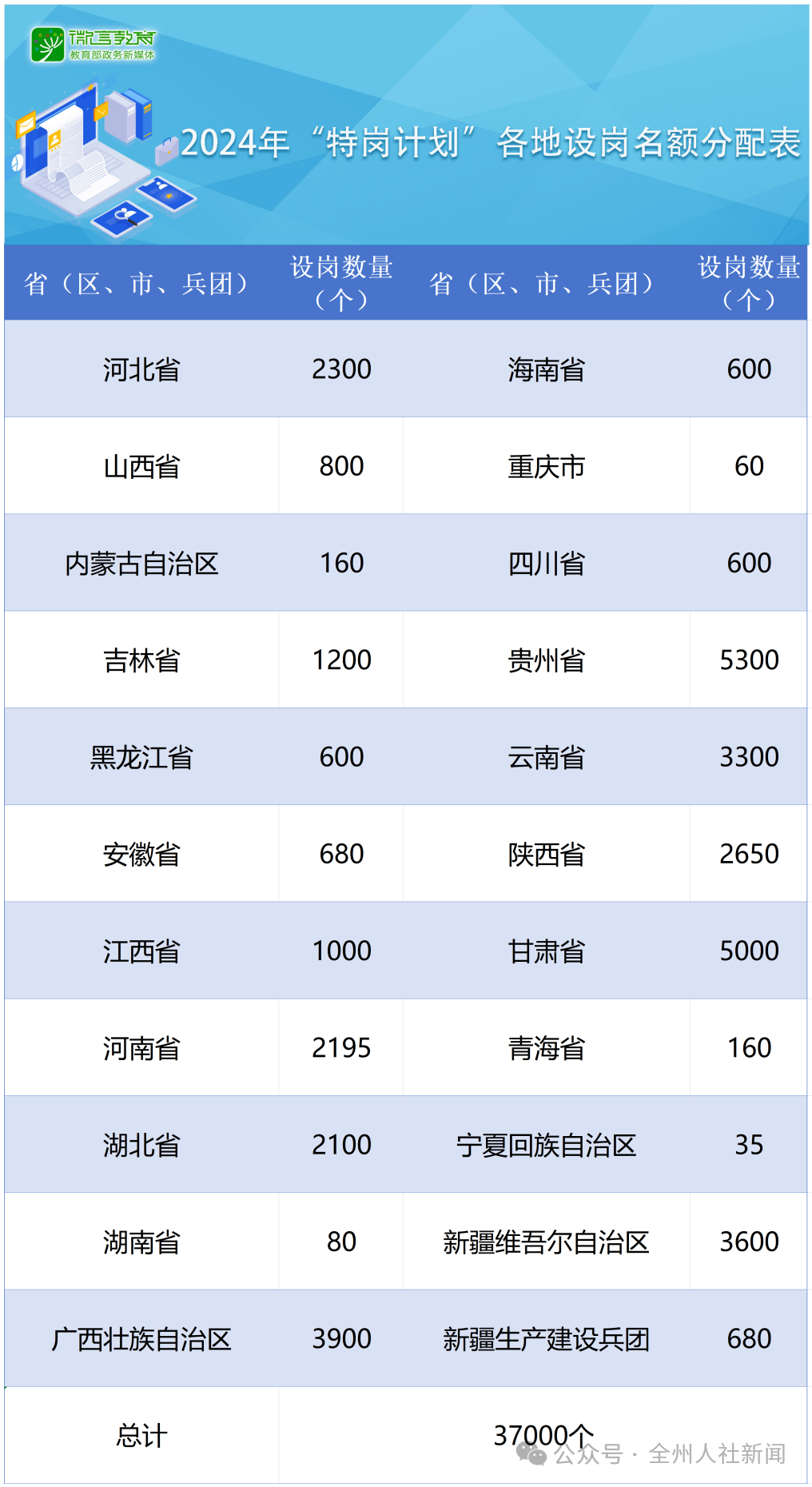 (二)招聘数量。2024年全国计划招聘“特岗计划”教师37000名,各省(区、市)和新疆生产建设兵团的招聘名额见2024年“特岗计划”各地设岗名额分配表(附件)。