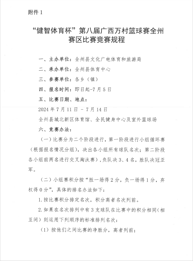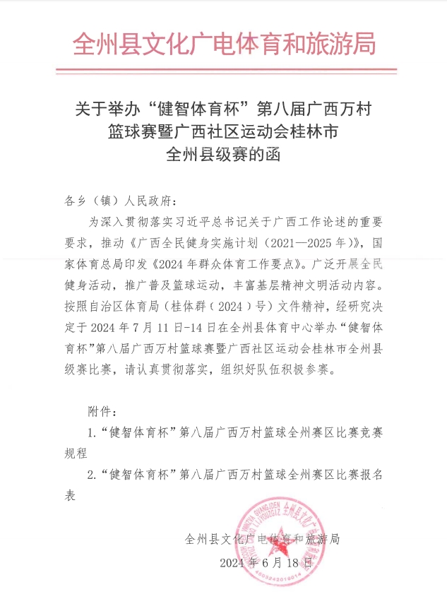关于举办“健智体育杯”第八届广西万村篮球赛暨广西社区运动会桂林市全州县级赛的函