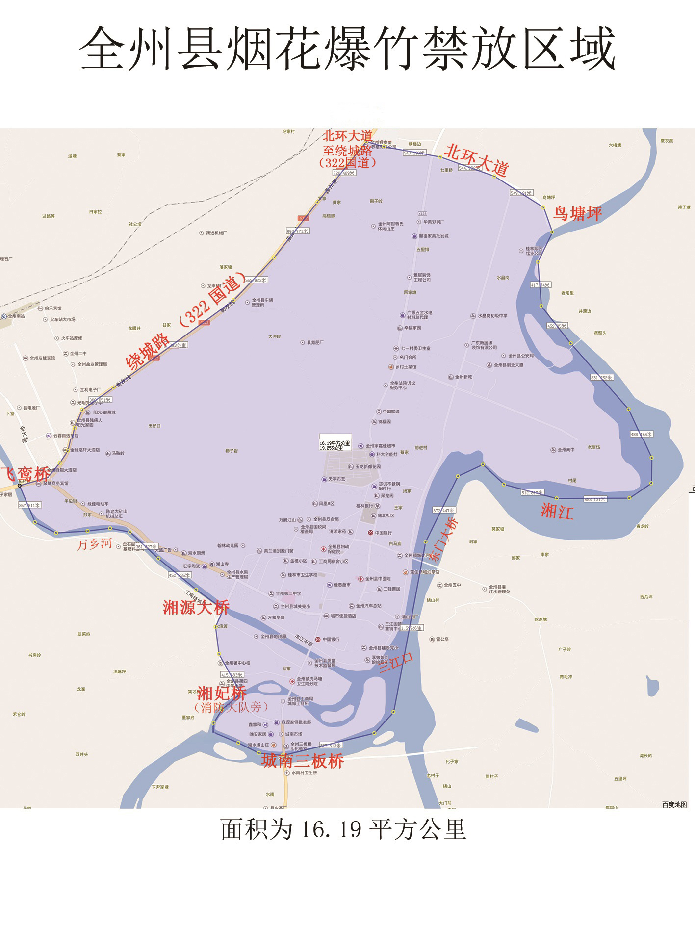 1. 城南三板桥沿湘江至东门大桥、东门大桥沿湘江至北环大道(鸟塘坪)、北环大道沿道路至绕城路(322国道)、绕城路沿道路至飞鸾桥、飞鸾桥沿万乡河至湘源大桥、湘源大桥沿全石支线至湘妃桥(消防大队旁)、湘妃桥沿水路往上至广西河、沿广西河至三板桥组成的环形范围以内的全州镇相关区域。(附图见附件)