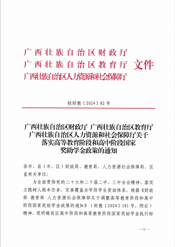 转发《桂财教〔2024〕82号 广西壮族自治区财政厅 广西壮族自治区教育厅 广西壮族自治区人力资源和社会保障厅关于落实高等教育阶段和高中阶段国家奖助学金政策的通知》