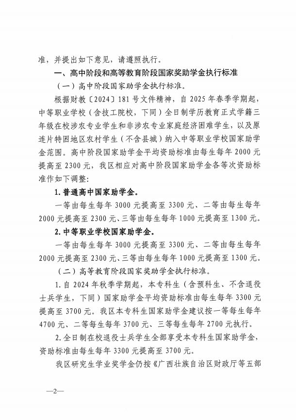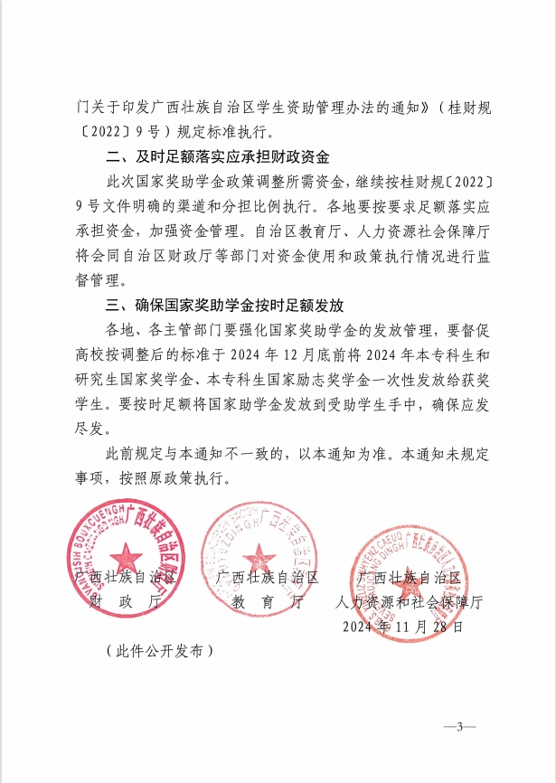 桂财教〔2024〕82号 广西壮族自治区财政厅 广西壮族自治区教育厅 广西壮族自治区人力资源和社会保障厅关于落实高等教育阶段和高中阶段国家奖助学金政策的通知.pdf