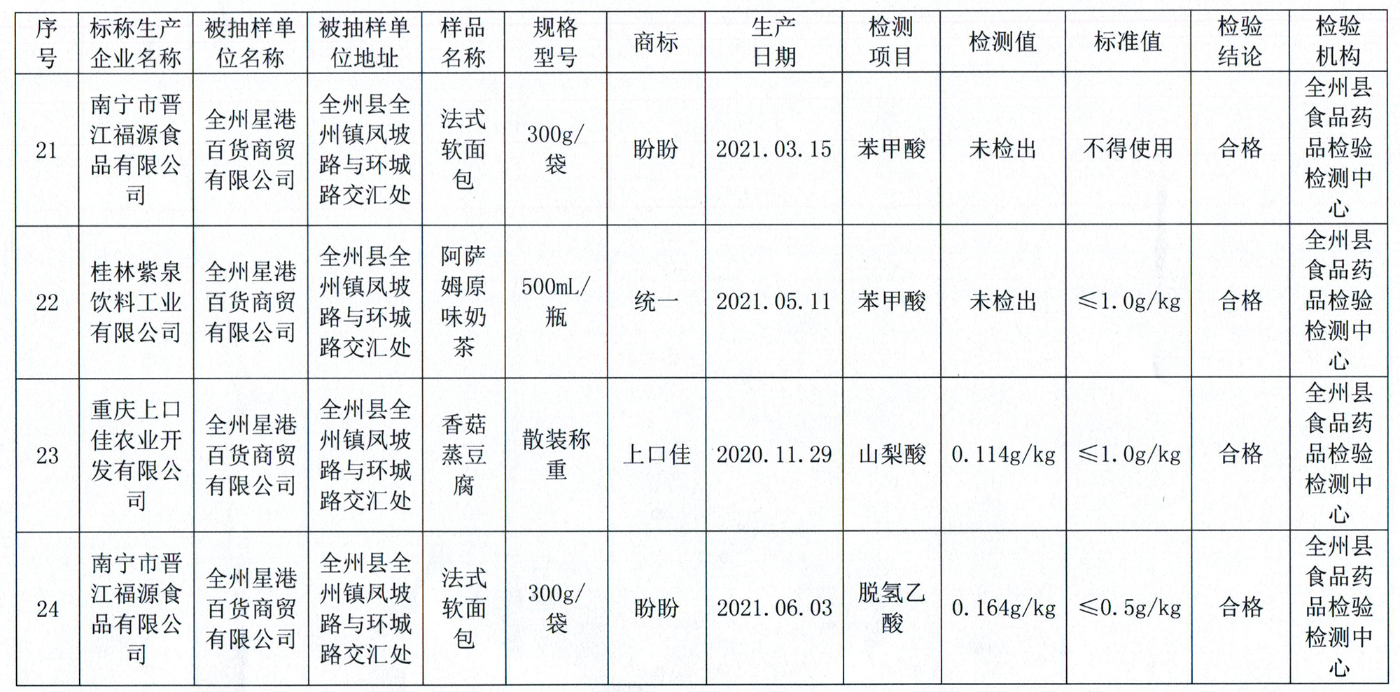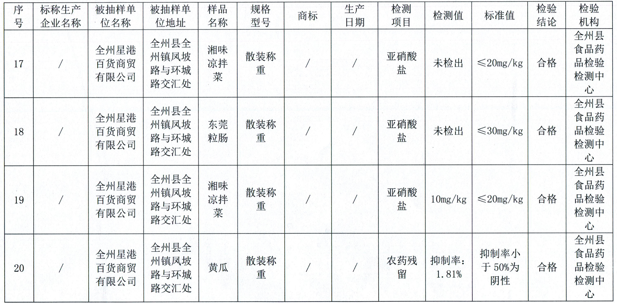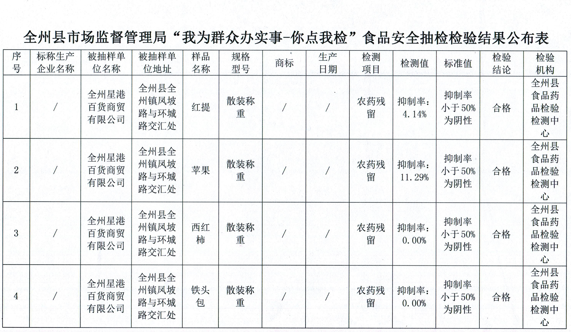 全州县市场监督管理局“我为群众办实事——你点我检”食品安全抽检检验结果公布表