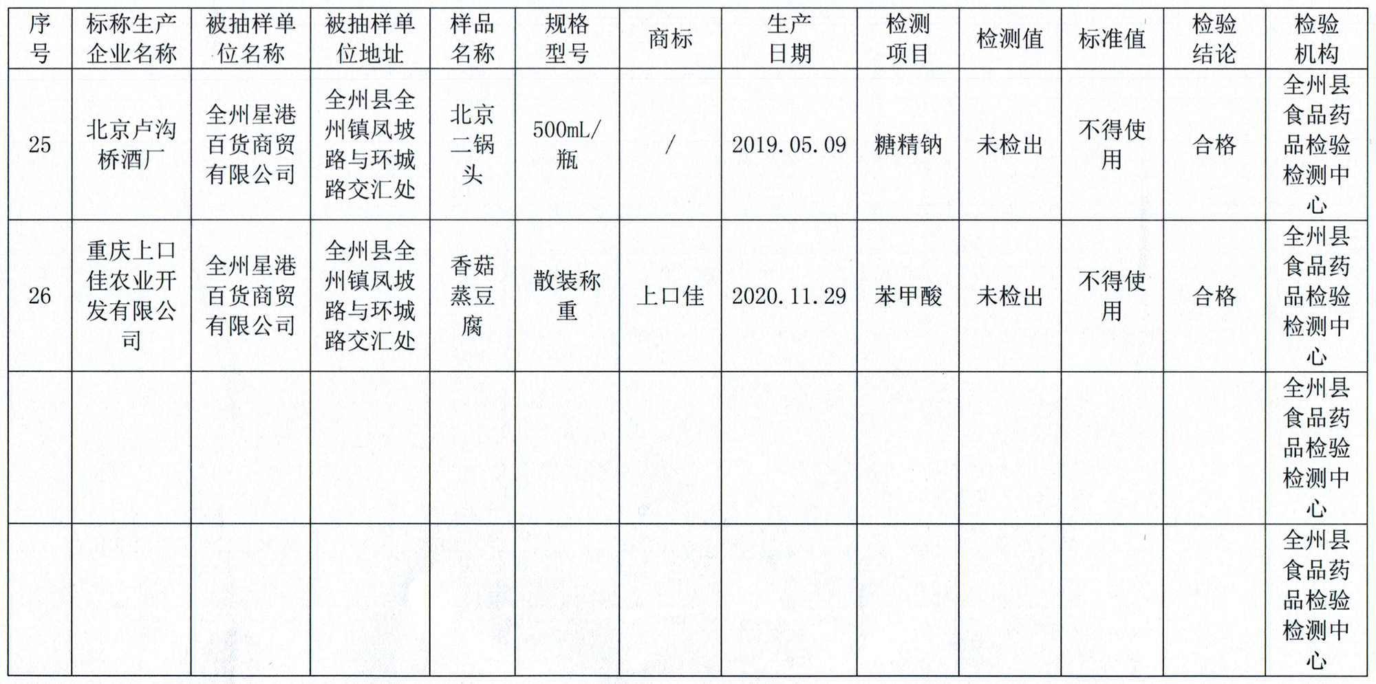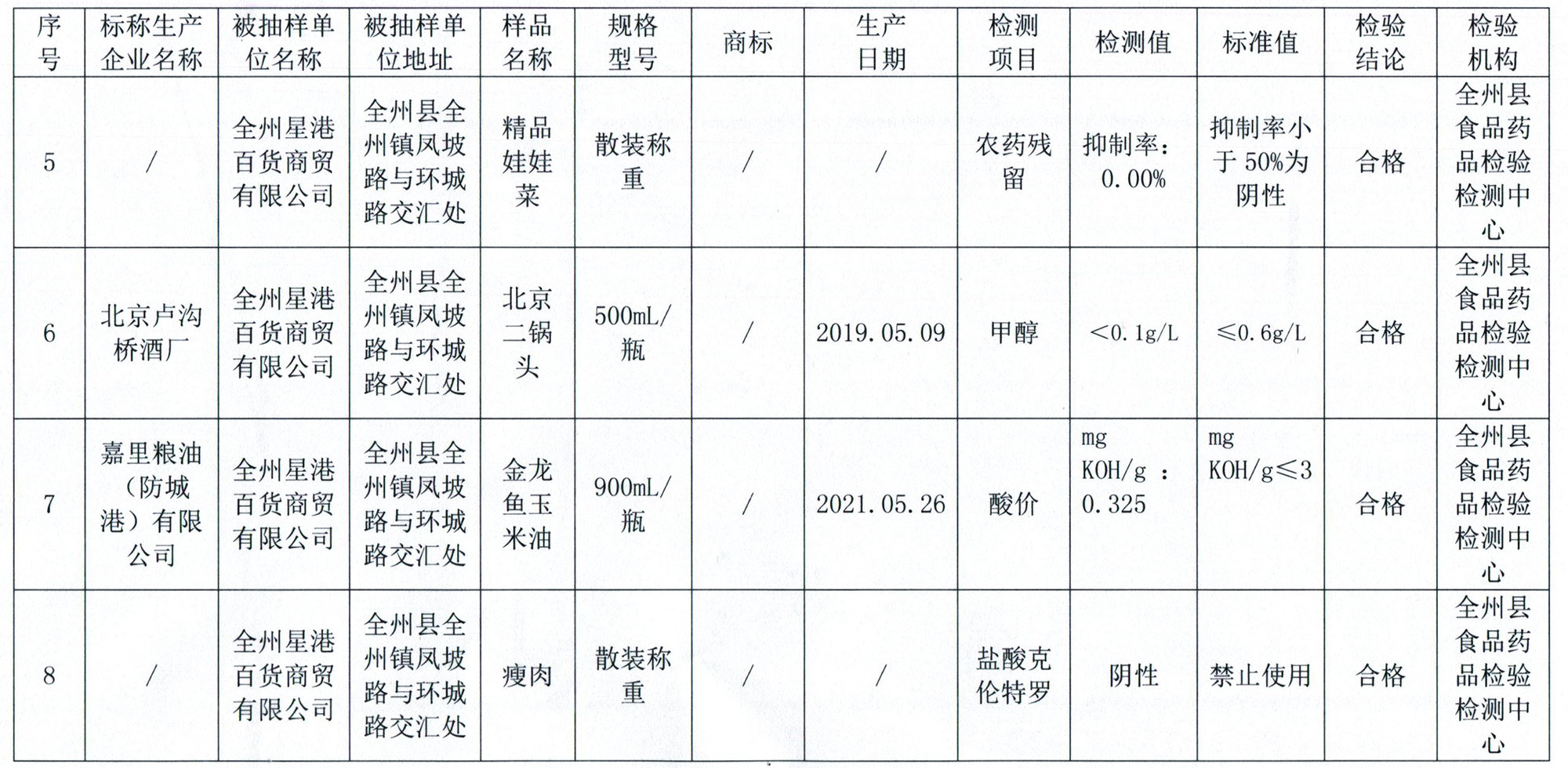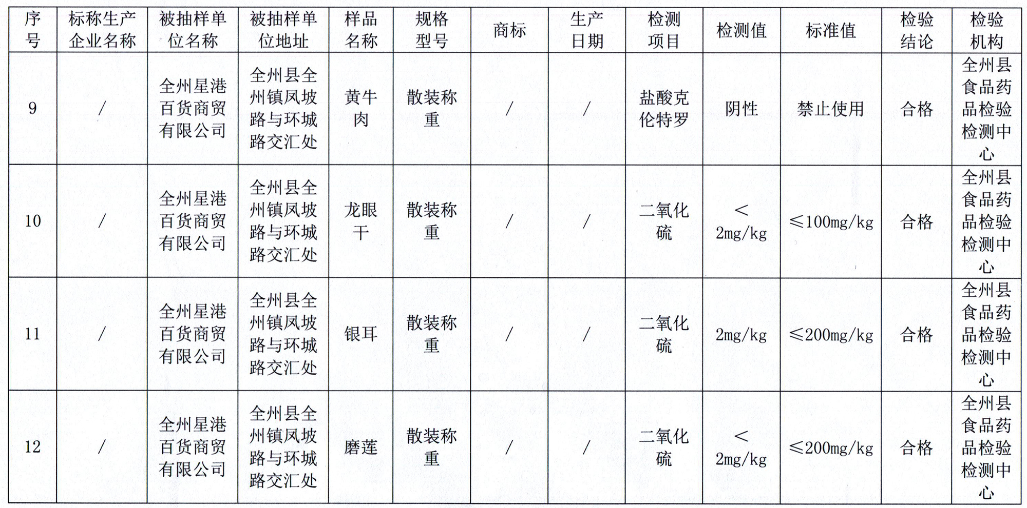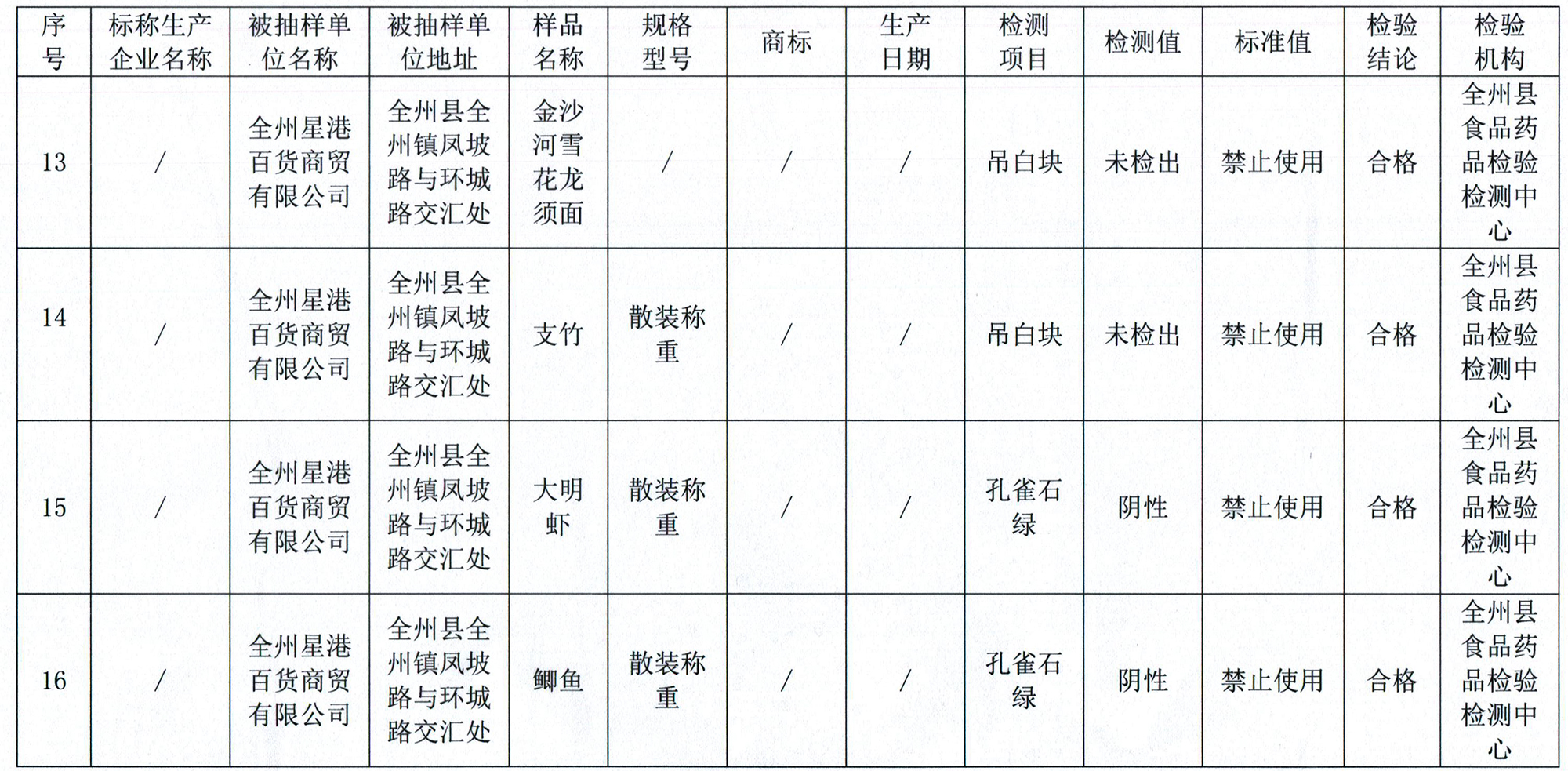 全州县市场监督管理局“我为群众办实事——你点我检”食品安全抽检检验结果公布表