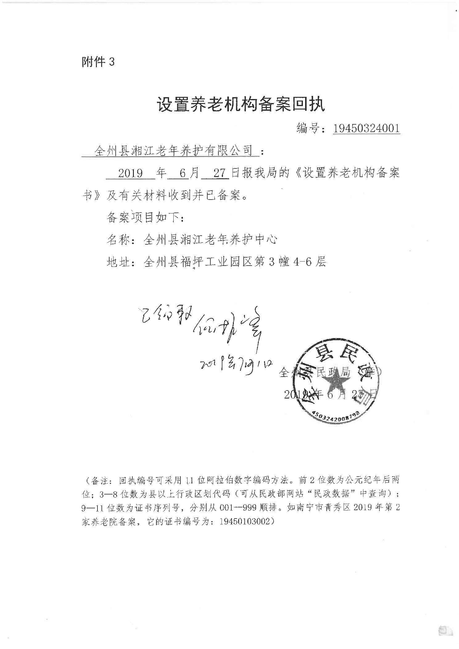 设置养老机构备案回执(全州县湘江老年养护中心)