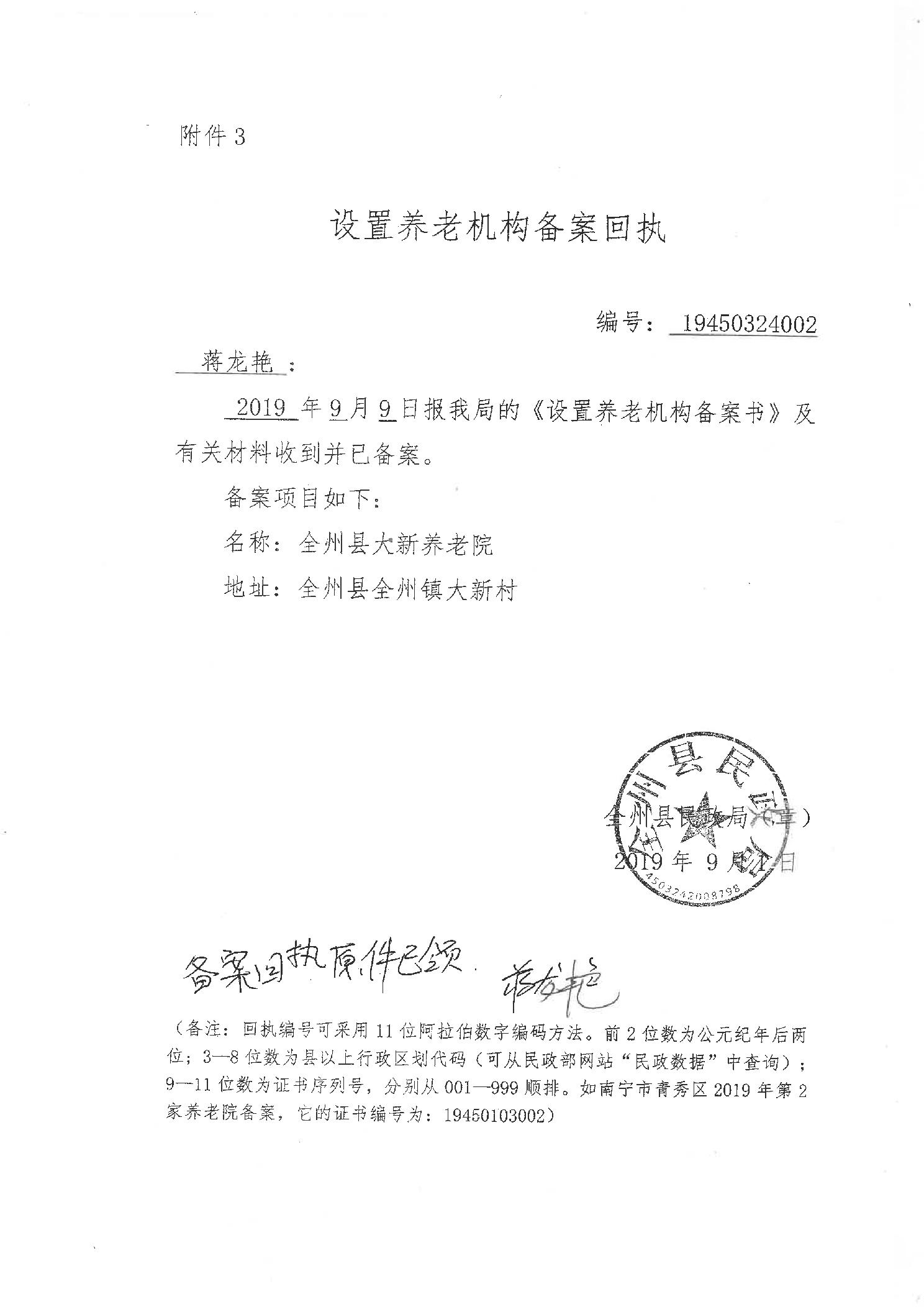 设置养老机构备案回执(全州县大新养老院)