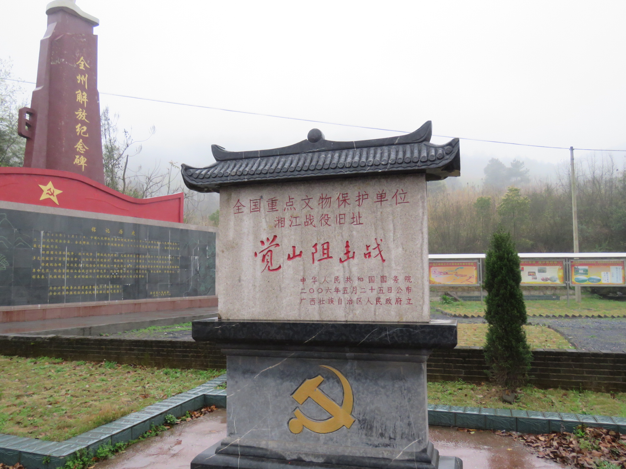 觉(脚)山铺在桂(林)黄(沙河)公路旁,全州县才湾镇南一村委,北距全州县城16公里,南距军委纵队渡河的界首渡口约30公里。觉山铺阻击战是湘江战役中著名的三大阻击战之一,是湘江战役中双方投入兵力最多、伤亡最大的阻击战场。1934年11月27日凌晨,红一军团主力率先从凤凰大坪渡口渡过湘江,准备占领全州和界首,在全县城外4公里的柘桥村与先期赶到的湘军发生遭遇战,被迫在离全州城南16公里处的脚山铺布置阻击阵地;并紧急电令远在道县的红一师,增援脚山铺。11月29日上午,湘军四个师,在十多架飞机的掩护下,轮番向一军团发起猛烈进攻,红军的工事被炮火摧毁,但各部队仍凭险死守,打到30日下午,觉山铺前沿阵地相继失守,红一军团被迫退到白沙河一带,构筑第二道阻击线。12月1日凌晨,军委命令一军团“无论如何,要将汽车路及西南诸路,保持在我们手中。”为了党中央和红军的生存、安全,12月1日拂晓,红一军团以白沙河为凭与敌人展开殊死拼搏。接近中午时分,得知中央红军主力已渡过湘江。一师和二师相互交替掩护,边打边撤,向西转移。