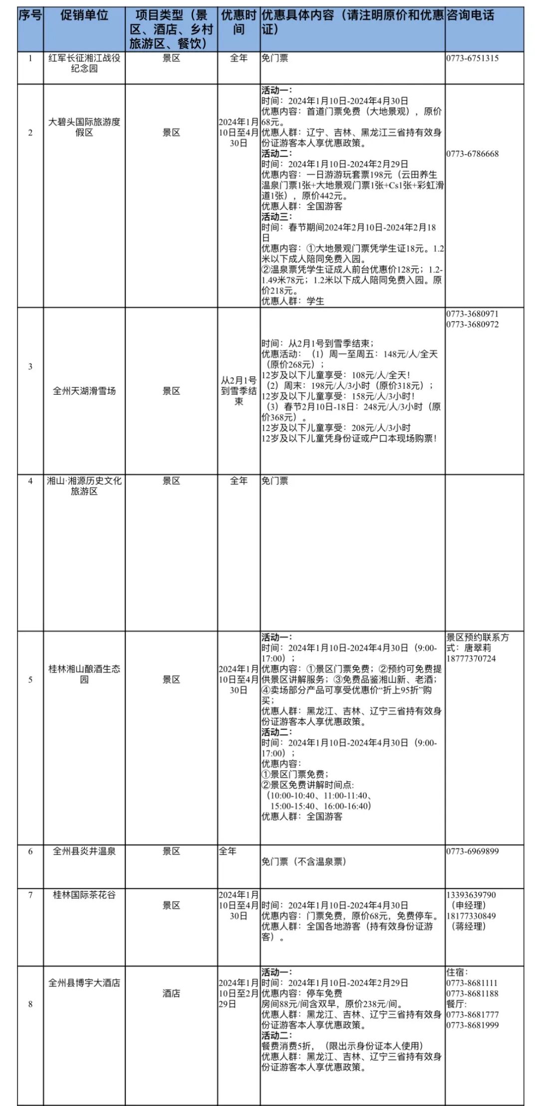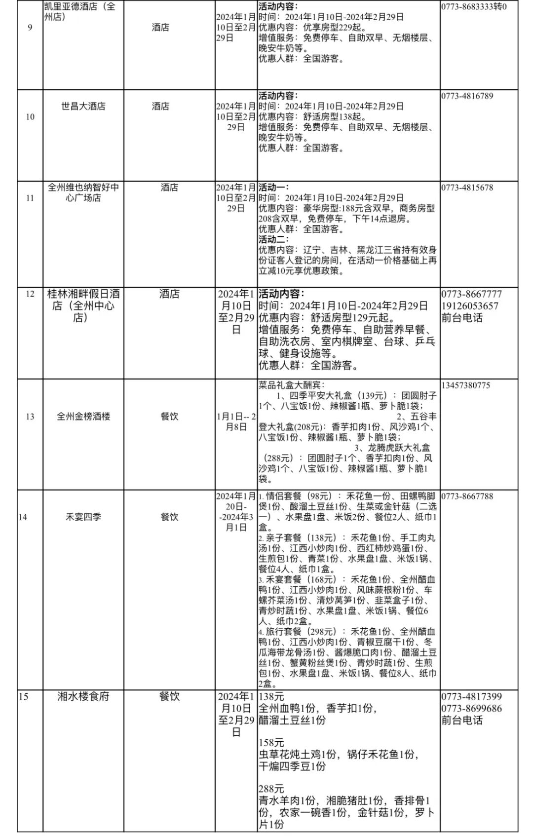 全州县春节期间优惠活动动汇总表