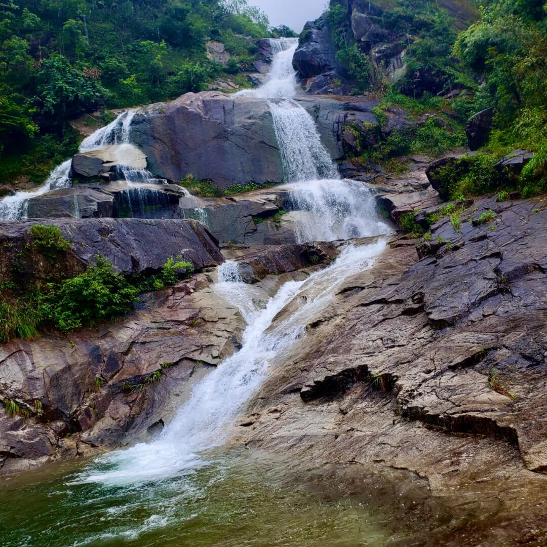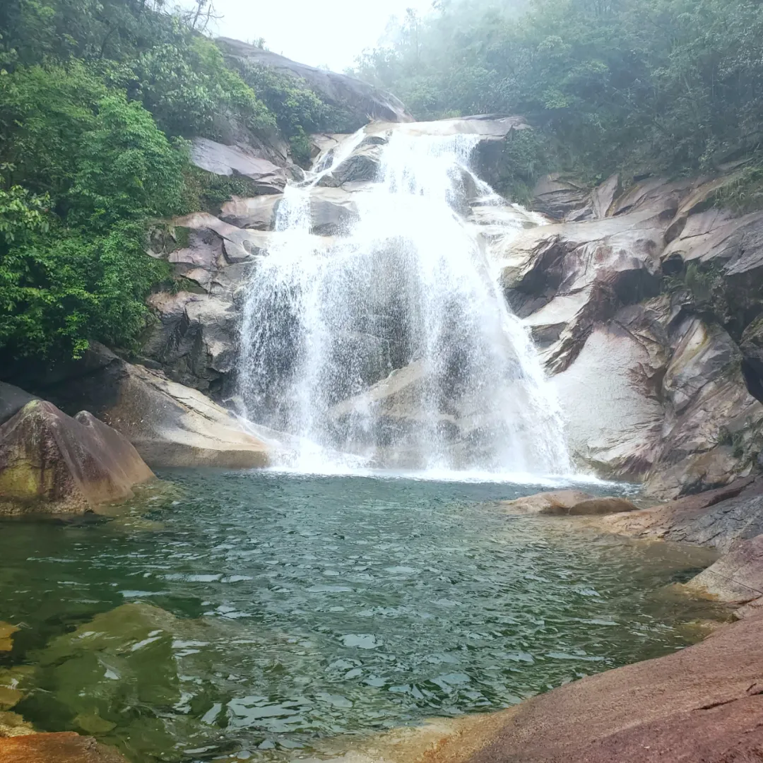 远眺前方,风景怡人,雾像一层薄纱环绕着前方连绵起伏的山峰,宛如仙境。仰视后方,瀑布像一块巨大的白纱披在青山少女的肩上,又似老人白雪般的银发一落千丈。它还如一颗未经雕琢的钻石,那样晶莹,那样淳朴。脚下的石头千姿百态,大家不得不惊叹大自然的鬼斧神工。