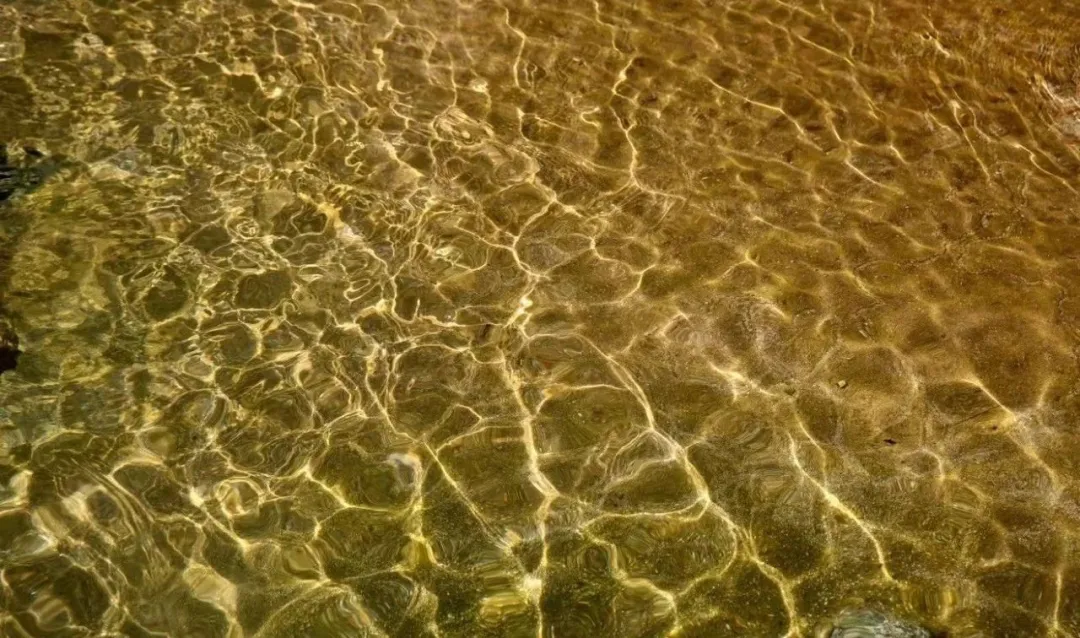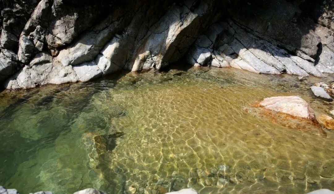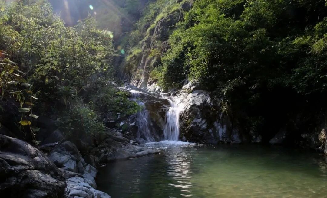 峡谷内流水潺潺,水潭处处,还有大大小小,或急或缓的瀑布。溪水清凉,清澈透明,水底是干净的沙,是避暑戏水好去处。阳光从高高的山顶照下来,穿过灌木洒进水潭,水波晃动,光影跳跃,潭里的水像果冻,质感厚重、微微颤动。站在水里,全身清凉。有山泉从石缝中流出,放心地捧起来喝,甘甜、清冽。