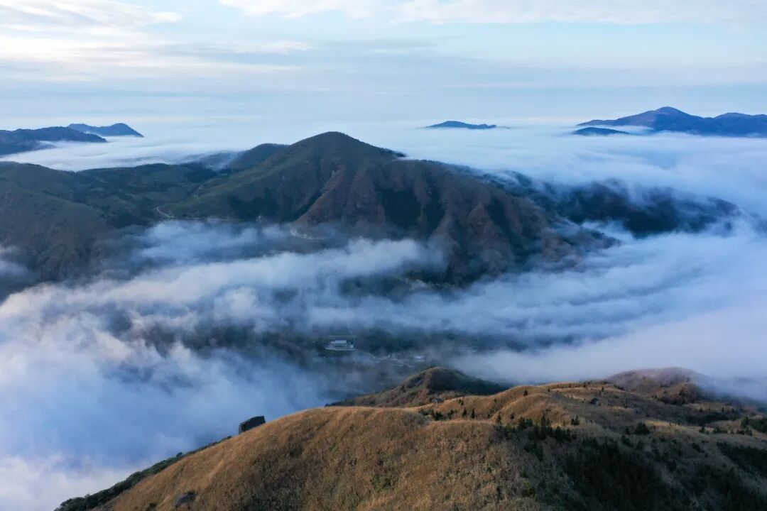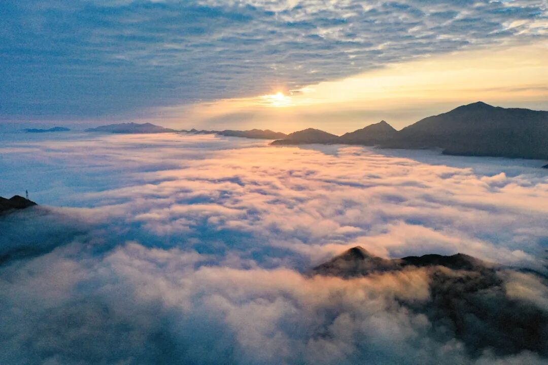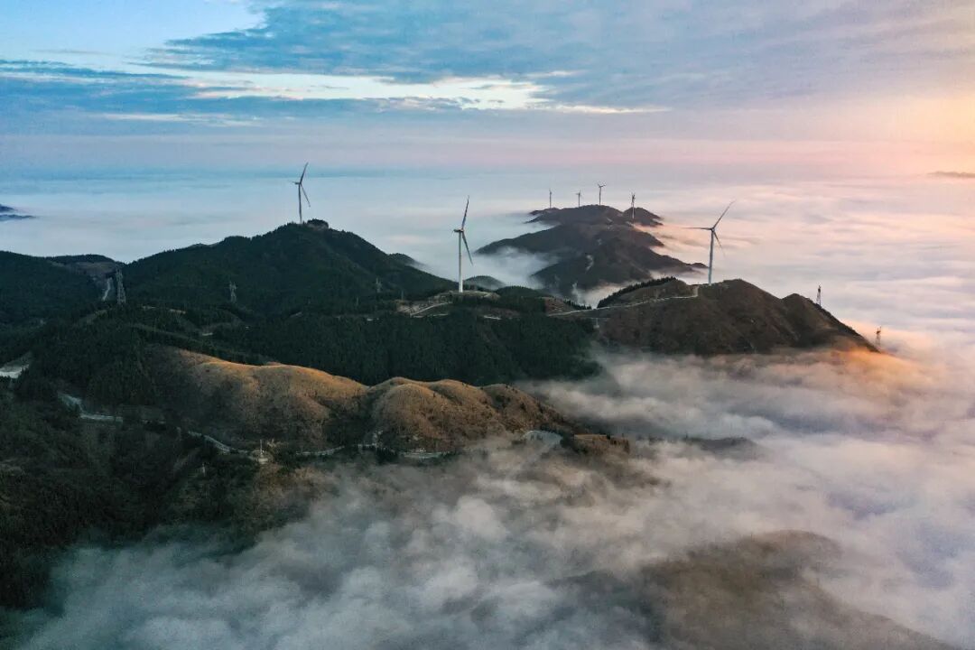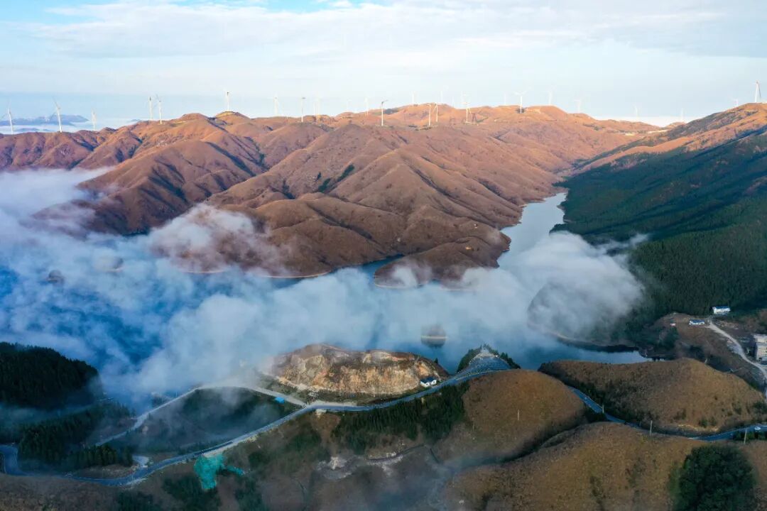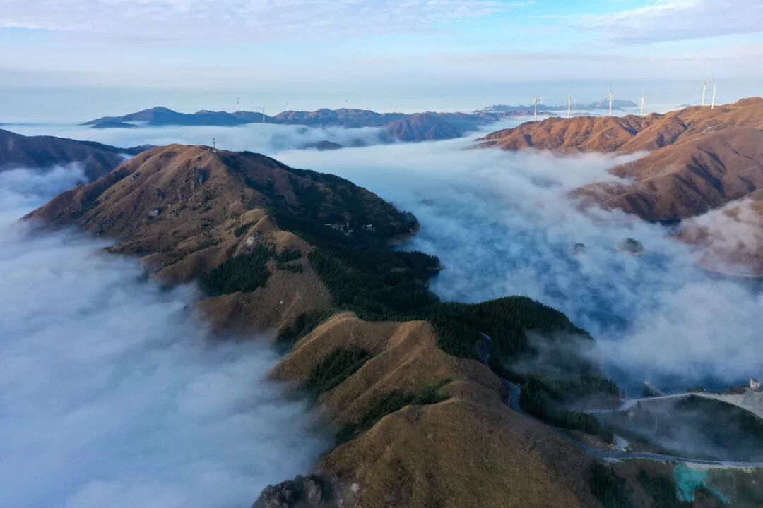11月20一21日,全州天湖国家湿地公园连续出现壮丽的云海景观。空中俯瞰,变换多姿的云海在魏巍的山脊间和天湖上空流淌,温暖的阳光照耀着洁白的云层,风力发电机组的桨叶在云中转动,景观美若仙境。据了解,全州天湖国家湿地公园地处越城岭山脉,平均海拔一千六多米,气候多变。