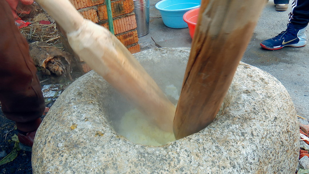经过一段锤打,石臼里的糯米被打成泥状,妇女们则将锤打成泥状的糯米团拉扯成大小合适的粉团,然后将粉搓圆压扁,于是一个个形如白玉、圆似银盘的糍粑便制作而成。每一个细白软糯的糍粑都蕴含了制作者的心意,也寄托着人们对美好生活的向往。每一个糍粑散发出特有的香味,让人们找回记忆深处珍藏的年味。大家在欢乐、喜庆的氛围中互叙邻里情,共话新生活,传递即将到来的新年祝福。