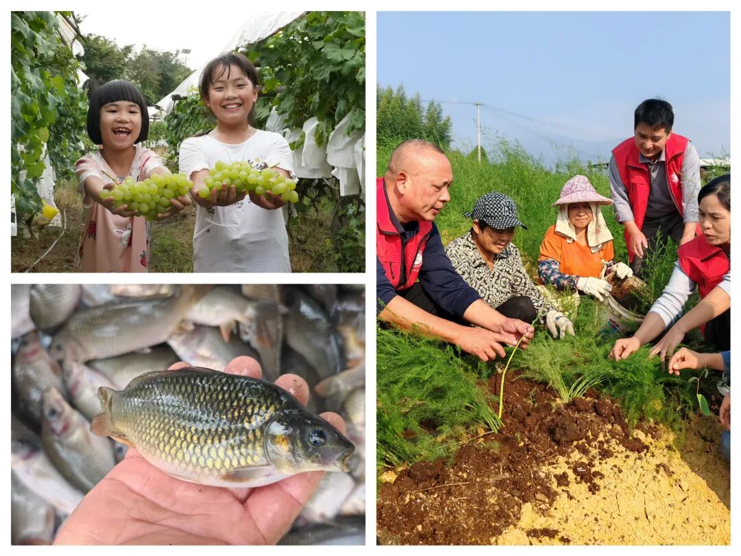 葡萄(左上) 、乌肚软骨禾花鱼 (左下)、 “芦笋+蚯蚓”养殖模式(右)等特色农业兴旺