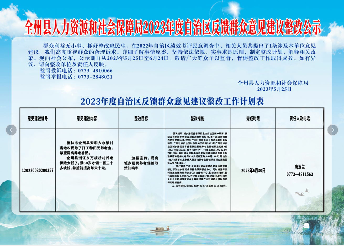 全州县人力资源和社会保障局2023年度自治区反馈群众意见建议整改公示