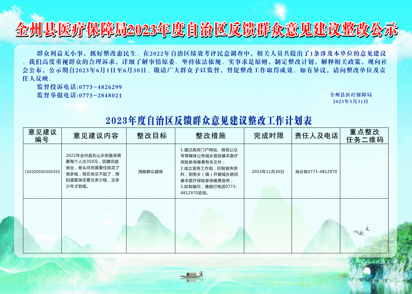 全州县医疗保障局2023年度自治区反馈群众意见建议整改公示