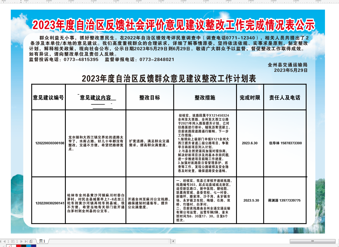 2023年度自治区反馈社会评价意见建议整改工作完成情况表公示