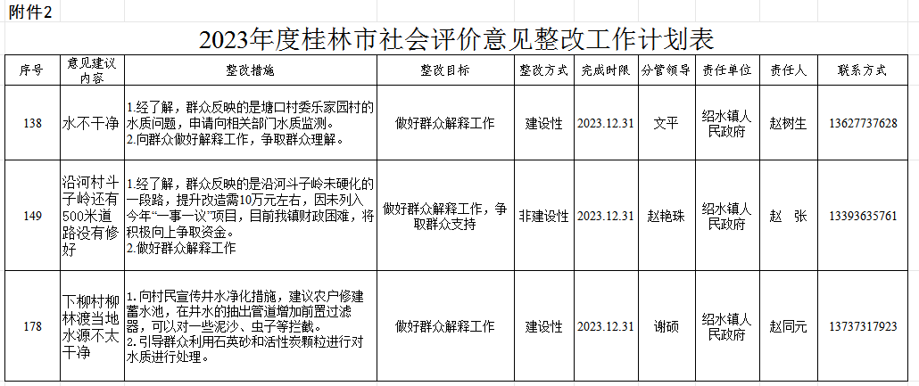 全州县绍水镇2023年度桂林市社会评价意见建设整改公示