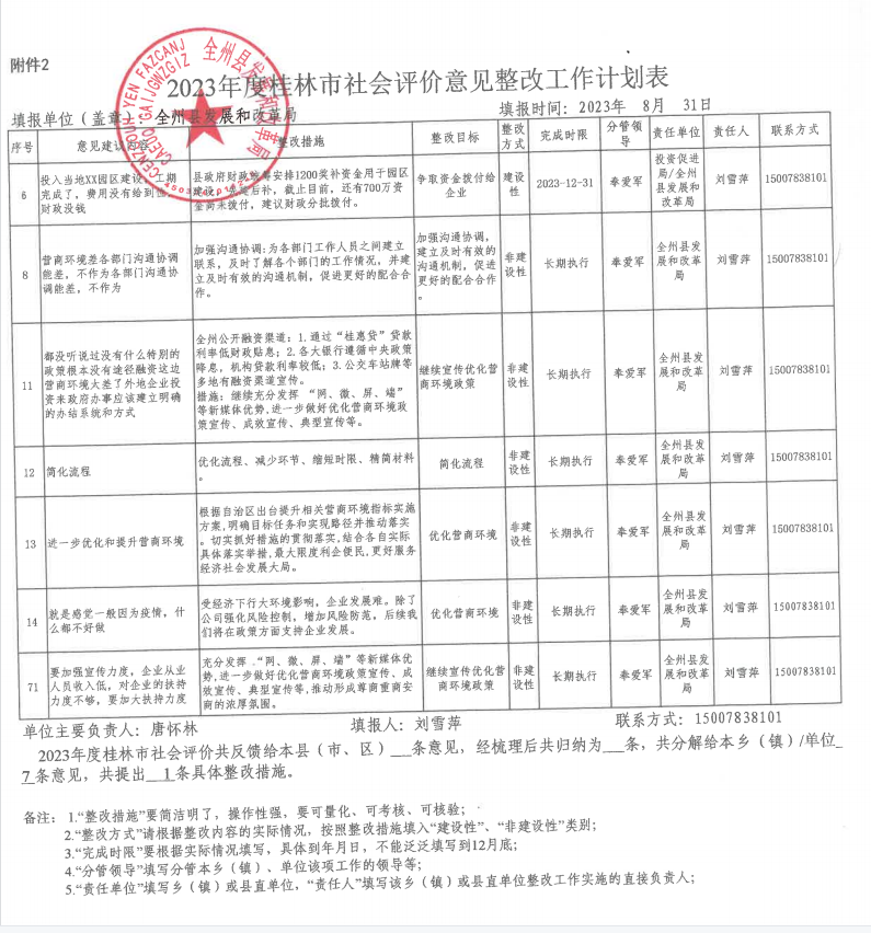 全州县发展和改革局2023年度桂林市社会评价意见整改工作计划表