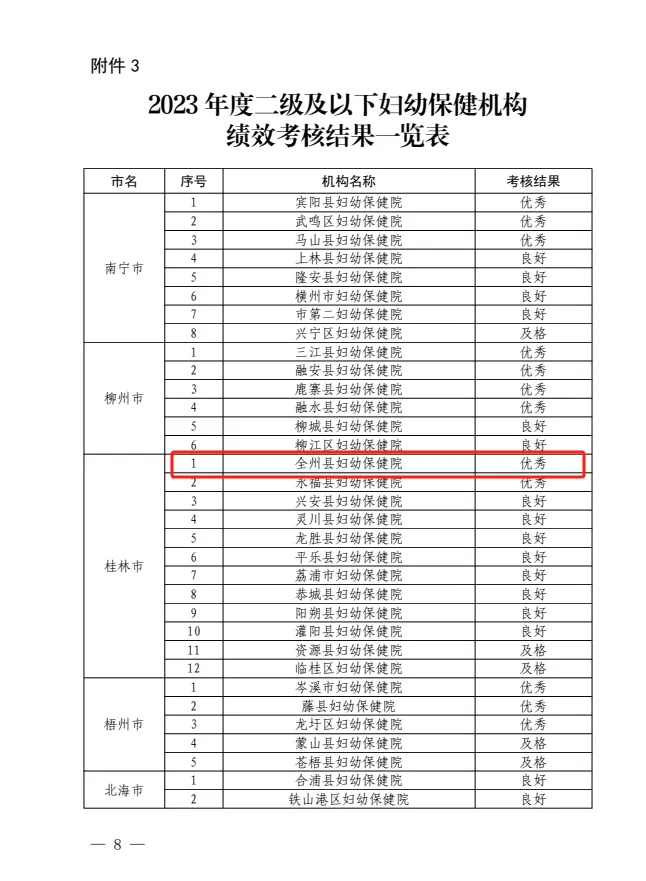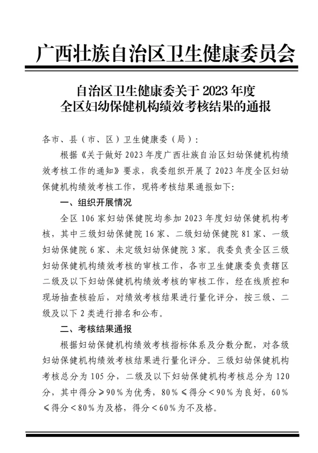 近日,广西壮族自治区卫生健康委印发了《自治区卫生健康委关于2023年度全区妇幼保健机构绩效考核结果的通报》,全州县妇幼保健院被评为妇幼保健机构绩效考核“优秀”单位,全州县妇幼保健院已连续两年获此殊荣。