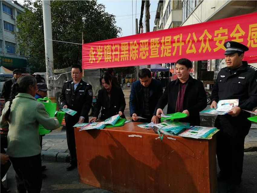 为深入贯彻落实党的十九大部署和习近平总书记重要指示精神,深入开展扫黑除恶专项斗争的宣传活动,进一步营造全党动员、全民参与的“扫黑除恶” 浓厚氛围,坚定党和政府打击黑恶势力的决心,11月22日,全州县永岁镇组织了综治办、司法所、派出所等单位,在集镇、农产品交易中心等人口集中区域,扎实开展“扫黑除恶”暨“群众安全感满意度双提升”工作宣传,增强社会各界参与、支持“扫黑除恶”工作的主动性和积极性。