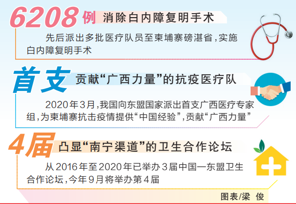 围绕着抗疫合作的重点,广西加强与东盟各国在公共卫生能力建设、疾病防控等多领域的深度交流,凸显了“广西渠道”的独特优势。“地中海贫血防治广西经验”走出国门,帮助“一带一路”国家和地区开展地贫防治;“一带一路”柬埔寨磅湛省消除白内障致盲行动项目帮助6208名白内障患者恢复光明;中医药壮瑶医药国际合作专项,形成了以东盟国家和港澳台地区为主、覆盖43个国家和地区的中医药领域对外开放合作格局。