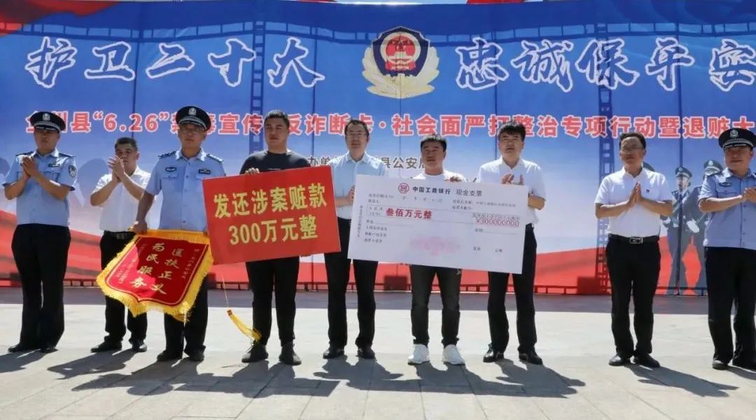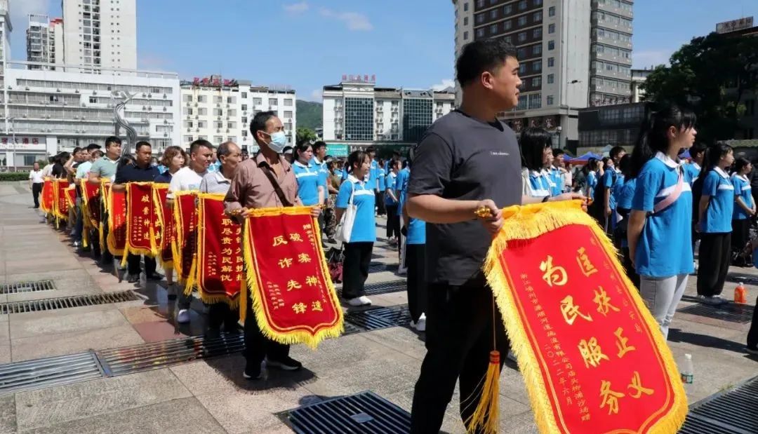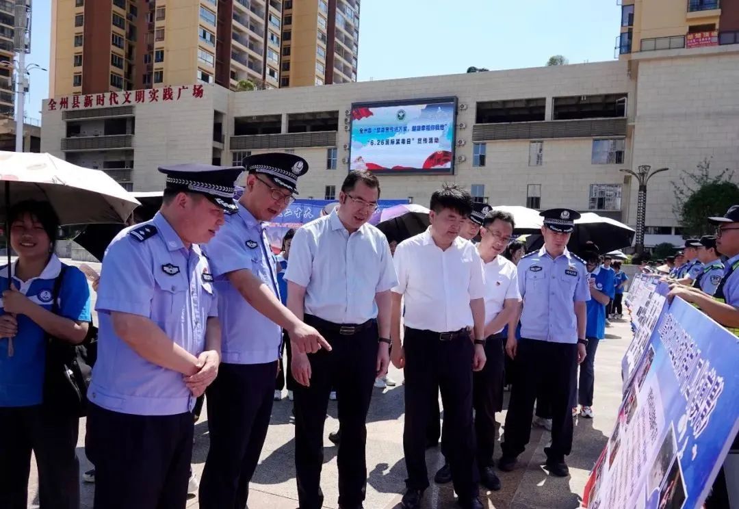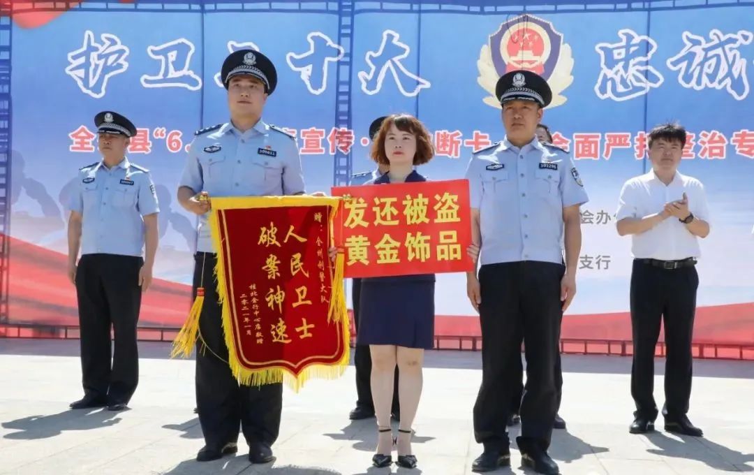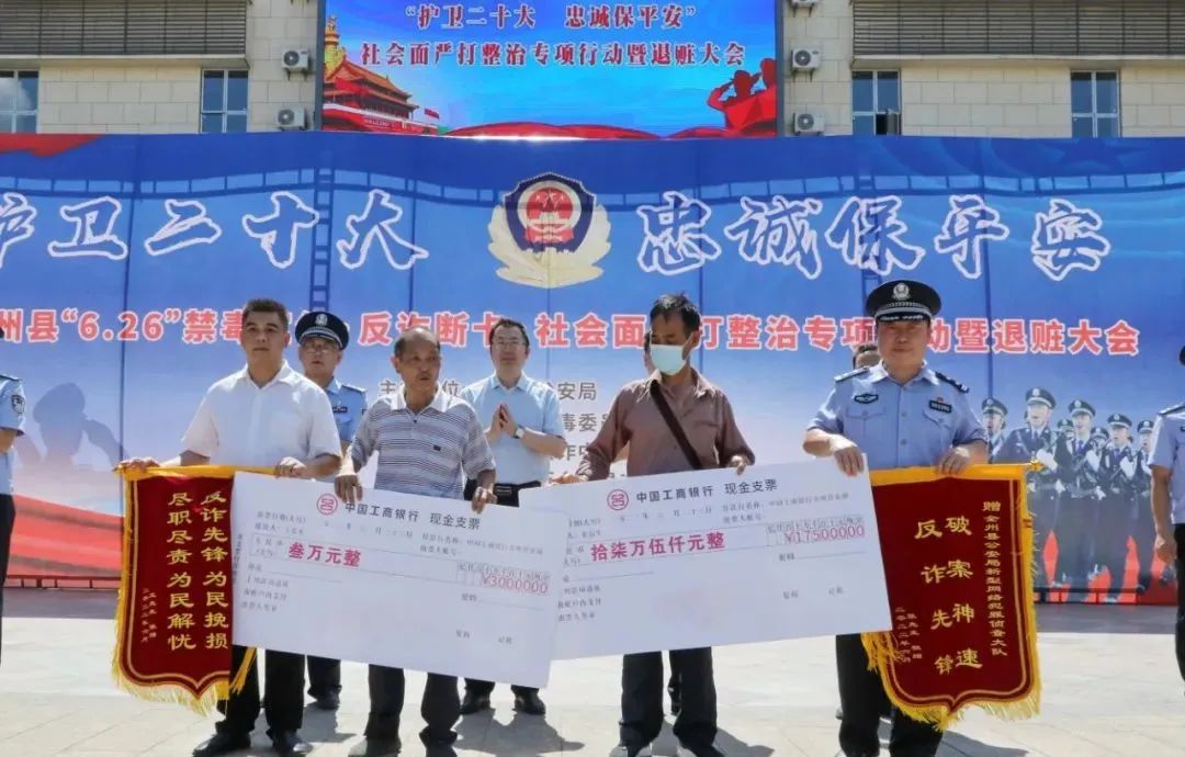 为向广大人民群众展示公安机关打击违法犯罪所取得的成果,彰显公安机关惩恶扬善、服务为民、守护平安、维护稳定的决心,强力震慑违法犯罪分子,进一步提升群众自我防范意识,赢得群众支持和理解,力促群众安全感和满意度提档进位。6月26日,“6·26”国际禁毒日当日,“护卫党的二十大 忠诚保平安”全州县“6·26”禁毒宣传·反诈断卡·社会面严打整治专项行动暨退赃大会在县中心广场如期举办。县委副书记、县长邓世文出席会议并讲话,县委常委、政法委书记蒋龙云,副县长、公安局党委书记、局长彭桂川,各乡镇、县直有关部门领导,中国人民银行全州县支行及银行业代表,县公安局党委班子成员及部分民警、辅警代表,教师学生代表,村居委干部和物品失主代表共400余人参加了大会。