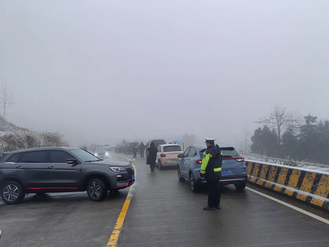 清晨浓雾未散,民警已在结冰湿滑路面,将“道路结冰 交通管制”的警示牌牢牢固定。风雪扑面、睫毛结霜,他们在寒风中耐心劝返车辆,在冰雪中筑牢第一道安全关。