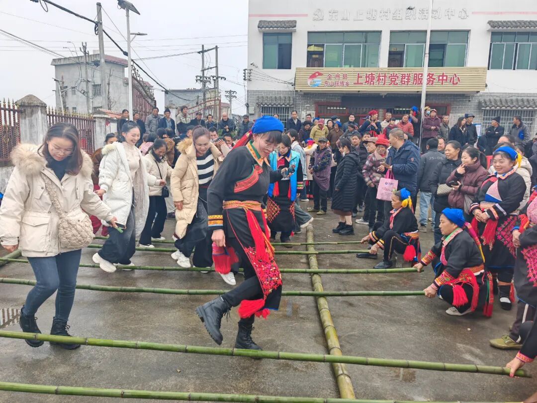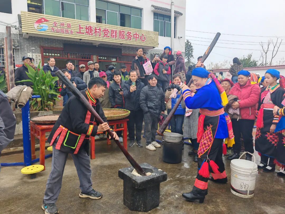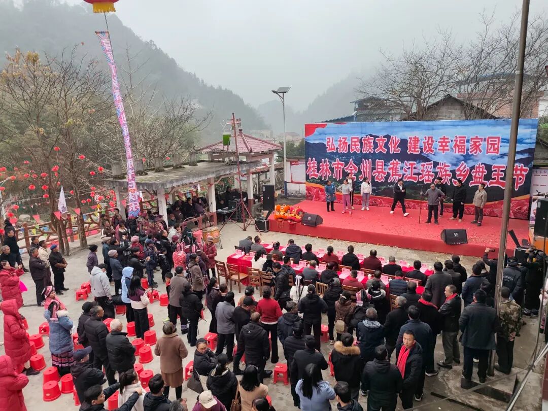 盘王节是瑶族同胞一年中最隆重的节日,2016年被列入国家级非遗名录。当天上午,在东山瑶族乡上塘村盘王节现场,当地瑶族同胞身穿节日盛装,与远道而来的游客欢聚一堂,并通过丰富多彩的文艺表演,全面展示了瑶乡日新月异的新面貌、新风尚。除了文艺表演外,当地瑶族同胞还以织瑶锦、打糍粑、礼敬盘王、篝火联谊、唱山歌等具有浓厚生活气息和民族特色的传统民俗表演,全面展示绵延千年的瑶族传统文化和中华民族团结一家亲的浓厚社会氛围。
